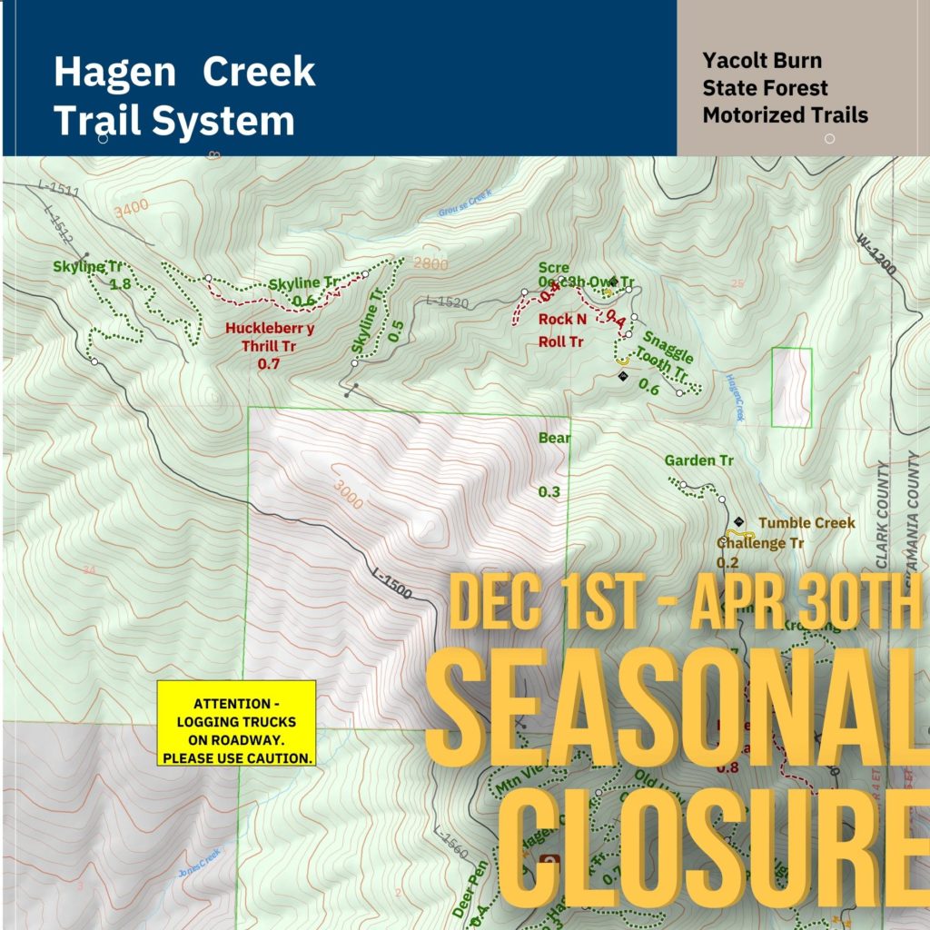 Every year, the Hagen Creek Trail System participates in a seasonal closure from Dec. 1st to Apr. 30th. We here at Piston’s Wild ask that everyone respect these closures to not only prevent excess erosion during the winter months, but to help in mitigating further efforts in removing public access to these trails. Seasonal closures are a great tool to combat any excess wear and tear on trails during our wet season. For more info on this seasonal closure, and others in the area, please visit the DNR Website